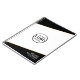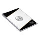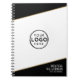 This sleek notebook features bold black angled accents at the top and bottom, separated from the white background by a clean gold line for a sharp, modern touch. Your company logo sits prominently in the centre of the front cover, while customisable lines of text along the bottom can include your name and title, business name and tagline, or any details you choose. Perfect for meetings, note-taking, or corporate use, this notebook keeps things polished and professional with fully editable text and layout.