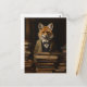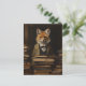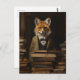 The image depicts an anthropomorphic fox dressed in formal attire, sitting behind a desk surrounded by tall stacks of old books. The fox wears a classic olive-green suit jacket, a crisp white shirt, a patterned waistcoat, and a neatly tied black bow tie. Its expression is calm yet sharp, with intelligent eyes that suggest deep knowledge and curiosity. The setting is dimly lit, with warm, golden light falling softly over the scene, evoking the atmosphere of an old library or study. The worn books add to the sense of history and wisdom, as if the fox is a scholar or professor engrossed in lifelong research.