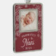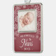 Celebrate his first Christmas as a grandmother with this sweet photo ornament featuring a baby photo framed by falling white snowflakes on a red background. "Promoted to Nani" appears beneath in white rustic lettering, along with the year.