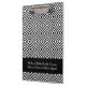 The Promotional Script Company Tagline Black & White Clipboard shows a classic square pattern and is designed as a template to easily replace the company tagline on the front, logo website, and QR code details on the back. It is part of the Black & White Business Card Designs & Materials collection. The black and white diagonal tiles pattern clipboard complements the professional collection as merchandise, reward, promotional gift, or unifying branded office accessory.