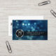 This dark themed proofreader business card features a chrome icon of a paper glass enclosed within a chrome circle over a dark background of blue hued bokeh ice lights. Your business name and text/tagline appear within a black text panel strip that runs from the icon from the left towards the right edge of the card. The background of the card consists of a dark themed grunge pattern. Your contact details appear on the lower left on the back of the card. Perfect for publishing, printing, writing, literature, literary arts, artistic, professional, impact, dark themes.
