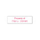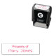 This self-inking stamp is a text template that you can edit to show a custom message. Currently, the top line of the display text says Property of. The bottom line is for the child's name (Shown: Property of Mary Jones).  The name appears in a handwriting-style font.