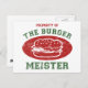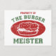 Perfect gift for the master hamburger griller at your house. Distressed design in red and green with sesame seed bun and hamburger. Text says PROPERTY OF THE BURGER MEISTER. Great gift for Father's Day, Mother's Day or a birthday. On baby, kids and adult T-shirts, mugs, caps, tote bags and more! PinkInkArt original!