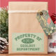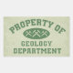 Property Of Geology Department - green collegiate style lettering with crossed rock hammer Xs on a parchment coloured background.