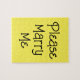 Here's a fun way to propose: Take these puzzle pieces and put them in a bag. Hide the box and any papers that come with the puzzle. Present the bag to the person you want to marry and ask that person to put the puzzle together. Give no information about the message. Watch that person you adore put the puzzle together and then (hopefully) squeal with delight!! Fun and romantic, this puzzle will allow you to propose marriage in a light and interesting way. Choose from a wide variety of colours and letter styles. You don't want to get married? That's fine. Change the message. Have fun! Customisable. By, Sharon Lee Hudson.