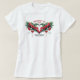 "PROSPERITY AND LIGHT." A modern T-shirt with a bold artistic print on the back. The main visual element is a composition of bright red roses, green leaves, and decorative swirls that form the shape of angel wings or a heart. Dripping paint or watercolor elements for a soft artistic effect, the phrase "PROSPERITY AND LIGHT" is slightly curved on top in a bold, elegant serif font. On the bottom is the quote: "In every dream lives the magic of possibility" in a quirky vintage font. The colour scheme includes reds, greens, and soft pinks on a white background. Style: fashion illustration, modern boho-chic, high-resolution digital print, suitable for street or boutique fashion.