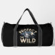 This black duffle bag features a striking design with a howling wolf silhouette against a moonlit, forested backdrop, accompanied by the powerful text "PROTECT THE WILD WILDLIFE CONSERVATION." It's a strong visual statement for conservationists and animal lovers advocating for the preservation of natural habitats.