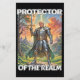 This captivating image depicts President Trump in gleaming armour, standing resolutely with a sword raised high against a vibrant, fantastical backdrop. The "Protector of the Realm," exudes strength and bravery, symbolising the ultimate guardian of a mystical kingdom. The lush landscape, complete with towering castles and dramatic skies, enhances the epic and adventurous atmosphere, making this image a perfect representation of heroic fantasy.