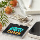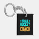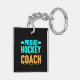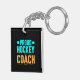 Hockey coach keychain with aqua blue and gold text reads Proud Hockey Coach.
