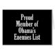 Proud Member of Obama’s Enemies List t-shirts, buttons, bumper stickers and gifts. The Obama White House is urging supporters to report people expressing opinions countering the Administrations political objectives. Any true conservative should be proud to be included on Obama’s enemies list.