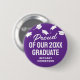 Purple Graduation Button featuring falling mortarboard caps, the text "proud of our 2025 graduate", and the grads name.
