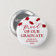 Red Graduation Button featuring falling mortarboard caps, the text "proud of our graduate", the grads name, and class year.