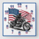 A motorcyclist speeds along, showcasing the American flag behind them as the sun sets, embodying freedom and patriotism on the open road.