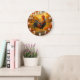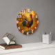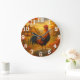 Rustic farmhouse clock showcases a vibrant rooster (orange/red/black plumage) standing tall on rocks at dusk, with thatched cottages, wooden fences, and red-leafed trees. White numerals on warm-toned backdrop create cosy pastoral charm—perfect for kitchen decor or Thanksgiving gifts.