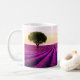 Lavender fields of Provence landscape printed on ceramic coffee mug, golden sunset sky with purple rows, perfect for summer vibes and travel lovers.