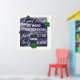 Texte blanc sur fond bleu style tableau d’école, entouré de trèfles à quatre feuilles verts.