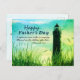 Inspirational quote custom Father's Day postcard depicts a lighthouse surrounded by tall grass and features Bible Verse Proverbs 20:7, "A righteous man walks in integrity. Blessed are his children after him."_