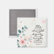 Inspirational quote scripture magnet depicts a beautiful floral design with pink flowers and blue leaves. It features Bible Verse Proverbs 31:25, "She is clothed in strength and dignity and she laughs without fear of the future." _