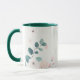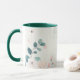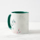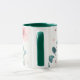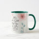 Inspirational quote scripture coffee mug depicts a beautiful floral design with pink flowers and blue leaves. It features Bible Verse Proverbs 31:25, "She is clothed with strength and dignity and she laughs without fear of the future." _