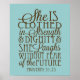 Every little girl, teen and woman needs this reminder. It reads, "She is clothed with strength and dignity, and she laughs without fear of the future." This product is available in a variety of styles and colours. If you would like to customise your colour click "edit" and "background". The text colours available are white, black and brown. Gift Options Here: http://www.zazzle.com/imtraciwithani/gifts?cg=196171184646056483&st=ranking&sd=asc