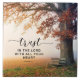Inspirational quote scripture ceramic tile depicts a peaceful fall nature photograph including a wooden bench under a large tree with colourful autumn leaves. It features Bible Verse Proverbs 3:5, "Trust in the Lord with all your Heart."