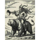 A surreal fusion of man and beast, this lion-headed herald rides a mighty bear while sounding a trumpet into the unknown. The striking black-and-white engraving explores power, instinct, and the strange harmony between wild forces.