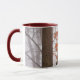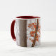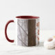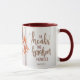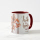 Inspirational quote scripture mug depicts a simple nature photograph with a branch of burnt orange and red autumn leaves in a forest of trees. It features a portion of Bible Verse Psalm 147:3, "He heals the broken hearted." Photo by Simon Berger. *