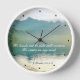 Inspirational quote scripture wall clock depicts a beautiful nature photograph of a lake surrounded by mountains. It features a portion of the beloved 23rd Psalm verses 2-3, "He leads me beside the still waters. He restores my soul."