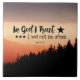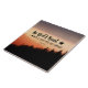 Inspirational quote scripture ceramic tile depicts black silhouette pine trees under a beautiful mountain sunset. It features Bible Verse Psalm 56:4b, "In God I Trust, I will not be afraid."