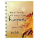 Personalised inspirational quote scripture notebook, journal depicts a nature photograph of an autumn branch of orange Maple leaves on a bright sunny background. It features an encouraging Bible Verse Psalm 71:14, "but as for me, I will always hove hope." Customise with a name or details of your choice.