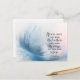 Inspirational quote postcard depicts a blue feather and features Bible Verse Psalm 91:4, "He will cover you with his feathers and under his wings you will find refuge."-