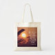 Inspirational tote bag depicts two feathers with the setting sun in the background and features Bible Verse Psalm 91:4, "He will cover you with his feathers and under his wings you will find refuge."~