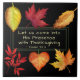 Inspirational quote Thanksgiving scripture ceramic tile depicts beautiful fall leaves surrounding the Bible Verse Psalm 95:2, "Let us come into his presence with thanksgiving;!"