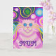 Groovy baby! A pink striped cat with swirling whiskers and a psychedelic rainbow patterned background. Greetings card with a pink, blue, green, purple and yellow customisable design for you to personalise with your own text, images and ideas. The text can easily be changed using the template provided or click the 'Customise It' button to make further alterations. An original digitally enhanced coloured pencil drawing by Jess Perry.