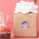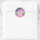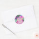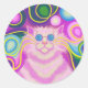 Groovy baby! A pink striped cat with swirling whiskers and a psychedelic rainbow patterned background. Round sticker with a pink, blue, green, purple and yellow customisable design for you to personalise with your own text, images and ideas. An original digitally enhanced coloured pencil drawing by Jess Perry.