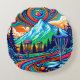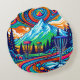 Ai art depicting a colourful disc course in the mountains and pine trees in blue, orange and green.