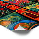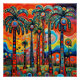 A.I. created print of Tall, vibrant palm trees grow in a psychedelic landscape while the setting sun produces exotic clouds in a multi-colored sky.