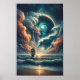A magical image of a vast cosmic whirlpool with vibrant colours. At its centre, a brilliant light shines, surrounded by swirling galaxies and stars. Enormous waves crash and twist, resembling the shape of the cosmos. On the water, a lone ship sails, dwarfed by the immense beauty around it. Planets hover in the distance, and the entire scene radiates mystery and wonder.