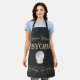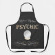 This custom apron features a mystical psychic theme over a black background. An image of a crystal ball is placed in the centre, with two banners below it. A sample Palm Readings service is printed across the first banner, and Tarot Cards on the second. You can personalise the apron to include your own custom text. A sample Madame Mystique medium name is printed at the top. The word Psychic is printed in an elegant gold font. It's perfect for a Halloween gift.