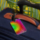 Very energetic abstract design with bright rainbow colours in a circle with vibrant contrasting dots.