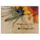 modern artistic digital mix of orange gerbera flower and a peacock feather in a grunge funky overlay. Customise with your own words of wisdom (quotes) Favourite name, and daily greeting or reminder. Gives a rustic feel to the kitchen benchtop.