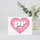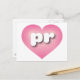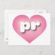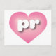 This postcard features a pink heart with a white-washed centre containing bold, rounded lower case letters pr, a playful version of the abbreviation for Puerto Rico, the enchanted isle. The reverse side of the postcard is blank, awaiting your handwritten sentiments or personalised text.