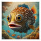 A Puffer Fish very detailed with expressive eyes is portrayed against a soft, blurred background. The natural colours enhance the lifelike appearance.