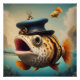 A Puffer Fish very detailed with expressive eyes is portrayed against a soft, blurred background. The natural colours enhance the lifelike appearance.