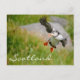 Postcard of a flying puffin bird landing with spread wings in Scotland with the tekst: 'Scotland'.