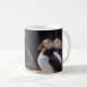 Photograph of 4 puffins looking in opposite directions on rocks at Farne islands, Northumberland.