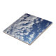 A bank of puffy white clouds breaks into small wispy pieces across the frame of the vertical photograph. The cloud cover is denser on the left and more sparse on the right, revealing a deep blue sky that is dark near the top of the photo and lighter near the bottom. Late afternoon sun highlights the right edges of the cumuli. It looks like torn apart cotton balls suspended in air.