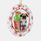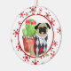 On the front of this Holiday ornament is a cute black and tan pug wearing a diamond pattern red and grey vest. Beside him is a green cactus with red blossoms. The images are placed on a white oval framed by a retro red snowflake pattern. The back of the ornament has the same background and oval with your custom text in two fields. Cute! *Thanks to Winchester Lambourne for the dog image in this design.