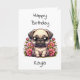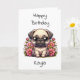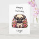 Cute chibi cartoon puppy dog pug with pink flowers personalised girl's birthday card.