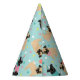 Cute birthday party Pug dogs with black and tan coats dressed in cute birthday outfits with balloons, cake and confetti pattern.